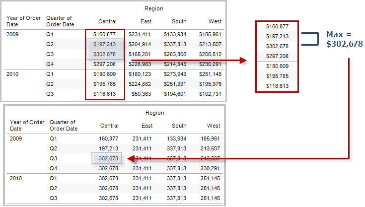 示例:WINDOW_MAX(SUM([Profit]), FIRST()+1, 0) along [Date],[Quarter]