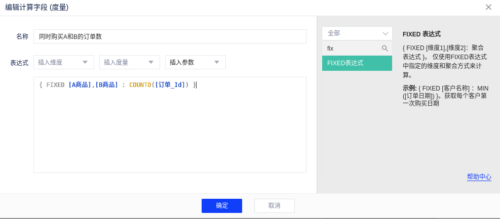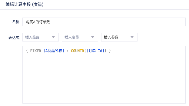 创建一个名称为“购买A的订单数”的计算字段,对“订单id”进行去重计数,可以得到购买A的订单数。如下图所示: