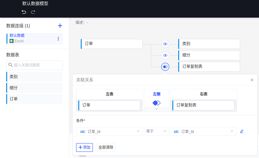 (1)在数据模型编辑页面,将订单表复制一份后与原订单表关联,选择“左合并”,关联依据为“订单_Id”,如下图所示: