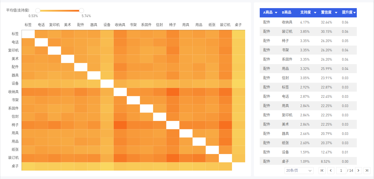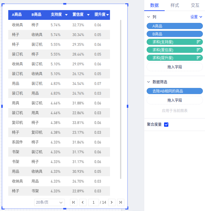 (3)再新建一个表格,展示「支持度」、「置信度」、「提升度」的明细数据。如下图所示: