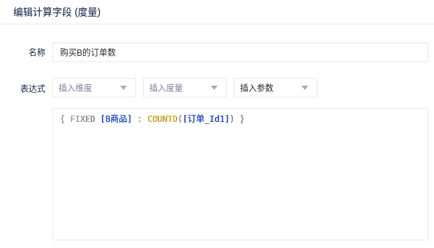 重复上个步骤,创建一个名称为“购买B的订单数”的计算字段,对“订单id1”进行去重计数,可以得到购买B的订单数。