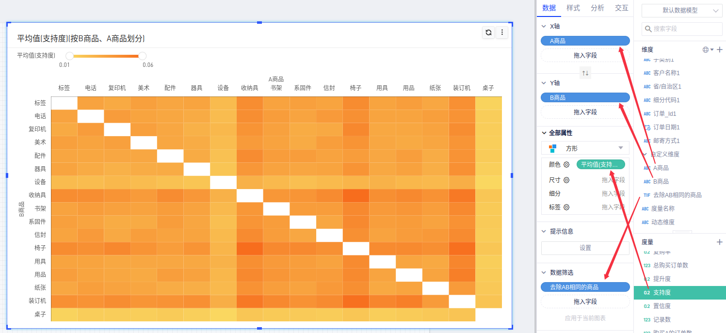 (2)将字段“A商品”和“B商品”分别拖入xy轴,布尔字段“去除AB相同的商品”拖入筛选框并选择“true”,在图形属性设置矩形快,然后将字段“支持度”拖入颜色栏并调整色块;