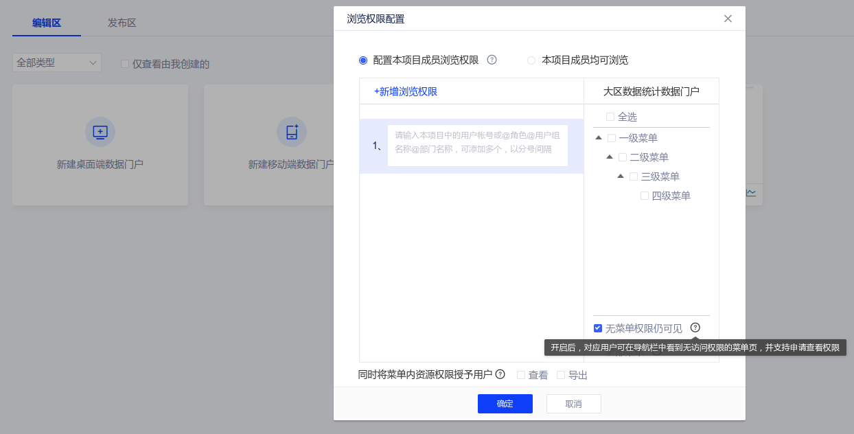 (2)数据门户支持配置“给用户显示无权菜单”。点击门户发布按钮后,编辑者可在浏览权限设置弹窗内,右侧菜单栏【全部菜单】下方新增【无权限菜单显示】勾选无权限仍可见