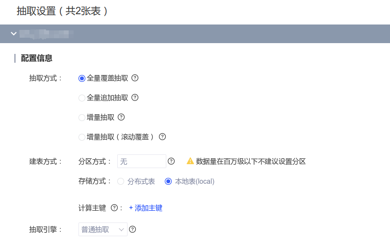 (2)抽取:抽取模式为全量覆盖时支持建表方式修改。抽取保存后,再次进入抽取的编辑,如果抽取方式是全量覆盖(或者从其他抽取方式修改为全量覆盖后),支持修改建表方式。
