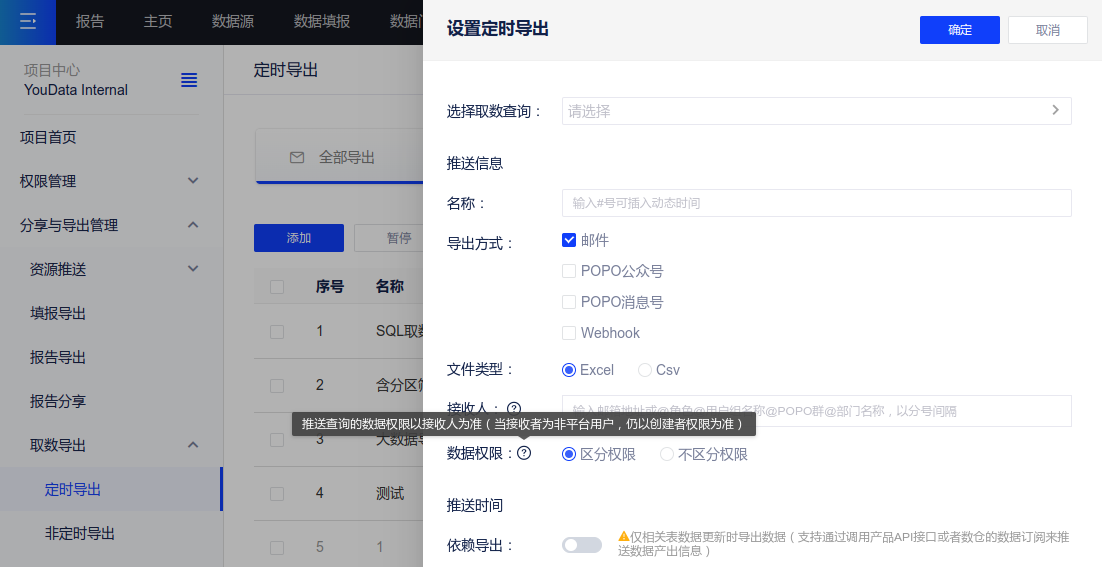 用户可选择区分权限或不区分权限;不区分权限与当前一致,以查询创建人权限为准,选择区分权限时,根据接收人所拥有的数据权限区分可见内容;上线后新建的取数定时导出默认为区分权限