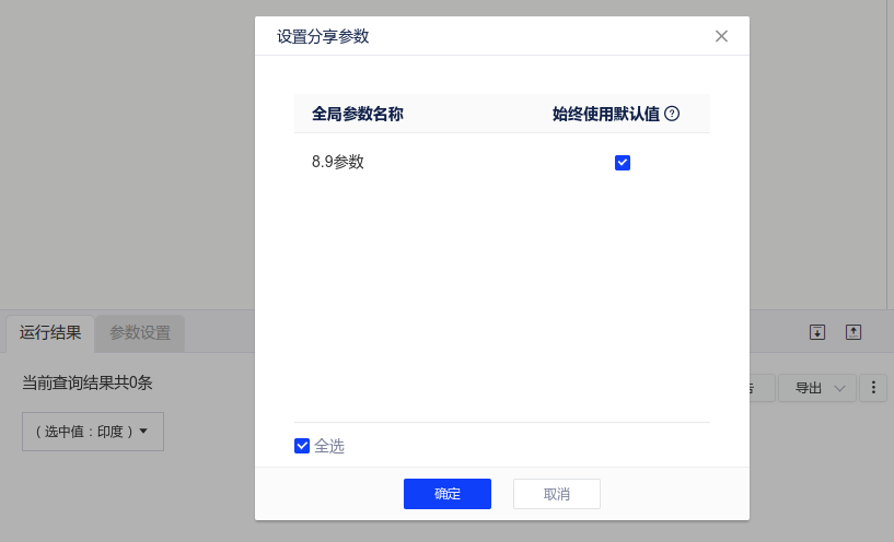 - 勾选时:他人分享中打开的查询始终初始选中全局参数的默认值,全局参数修改后