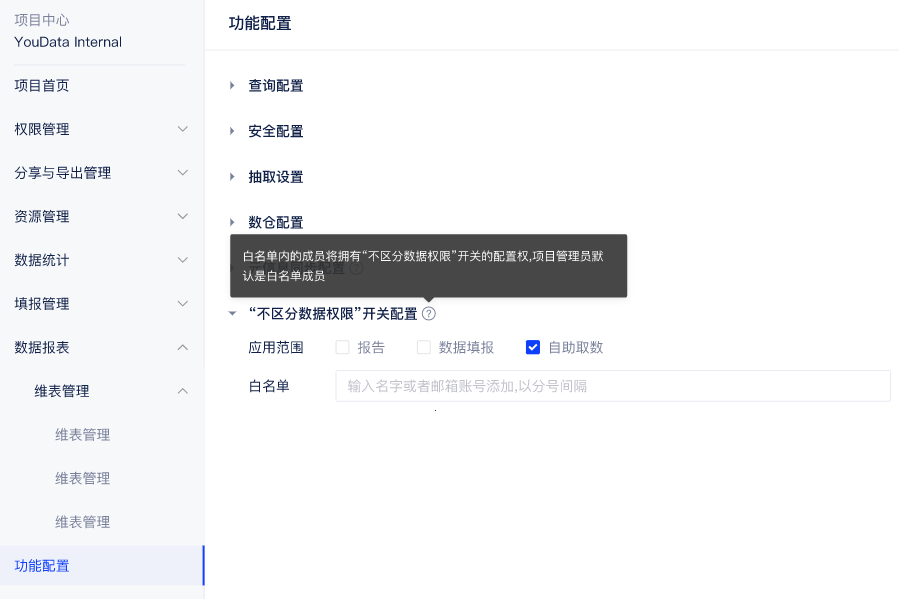 项目中心 - 功能配置 - 【“不区分数据权限”开关配置】新增【自助取数】选项,默认勾选