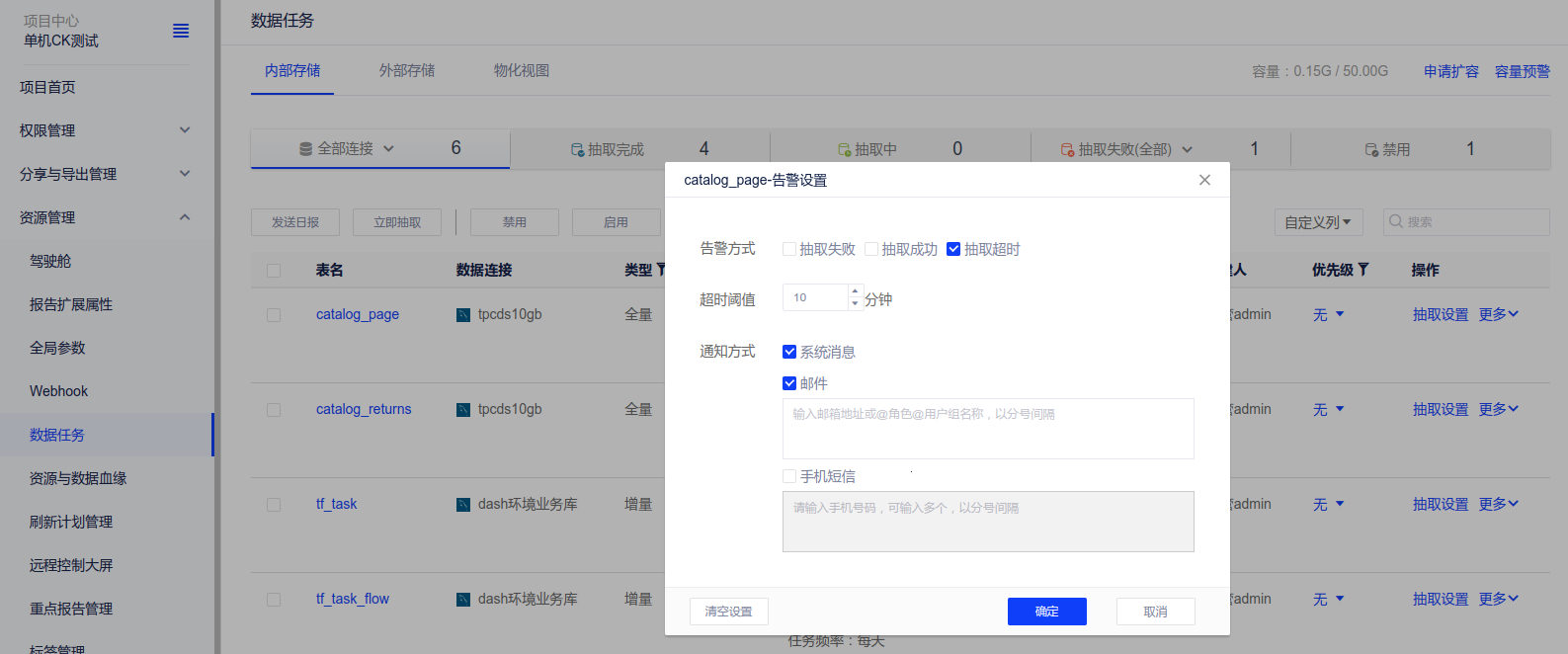 (3)抽取:抽取任务支持配置超时告警。设置后,抽取时长达到设定的阈值后就会通过用户设定的通知方式告警。