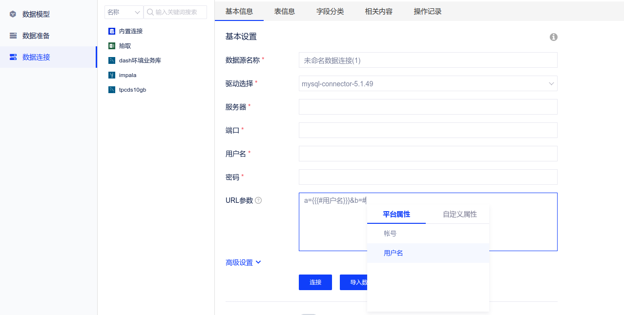 (1)数据连接:URL参数中支持插入当前访问用户的帐号、属性等系统参数。输入#号后,会自动展示可选择的参数。