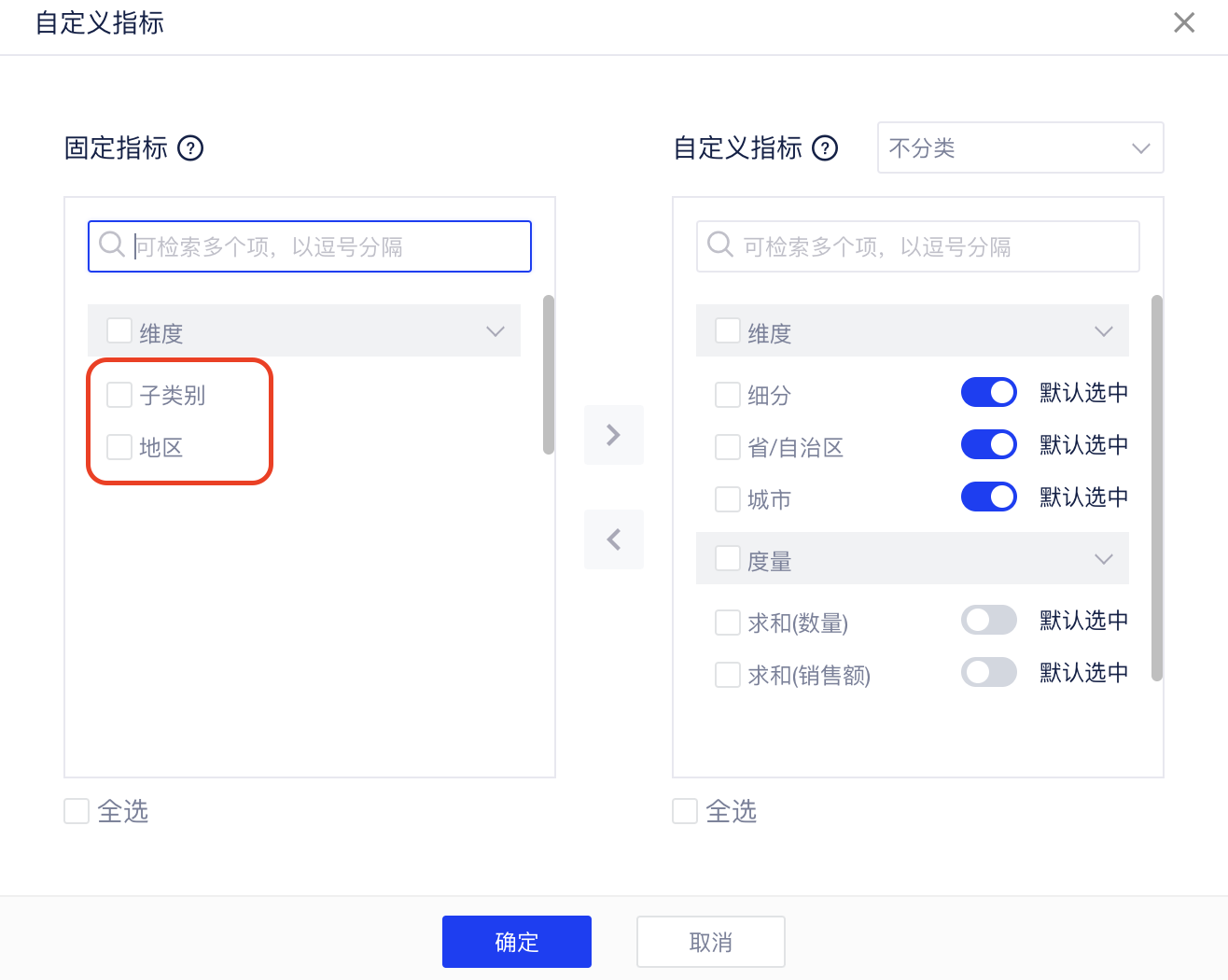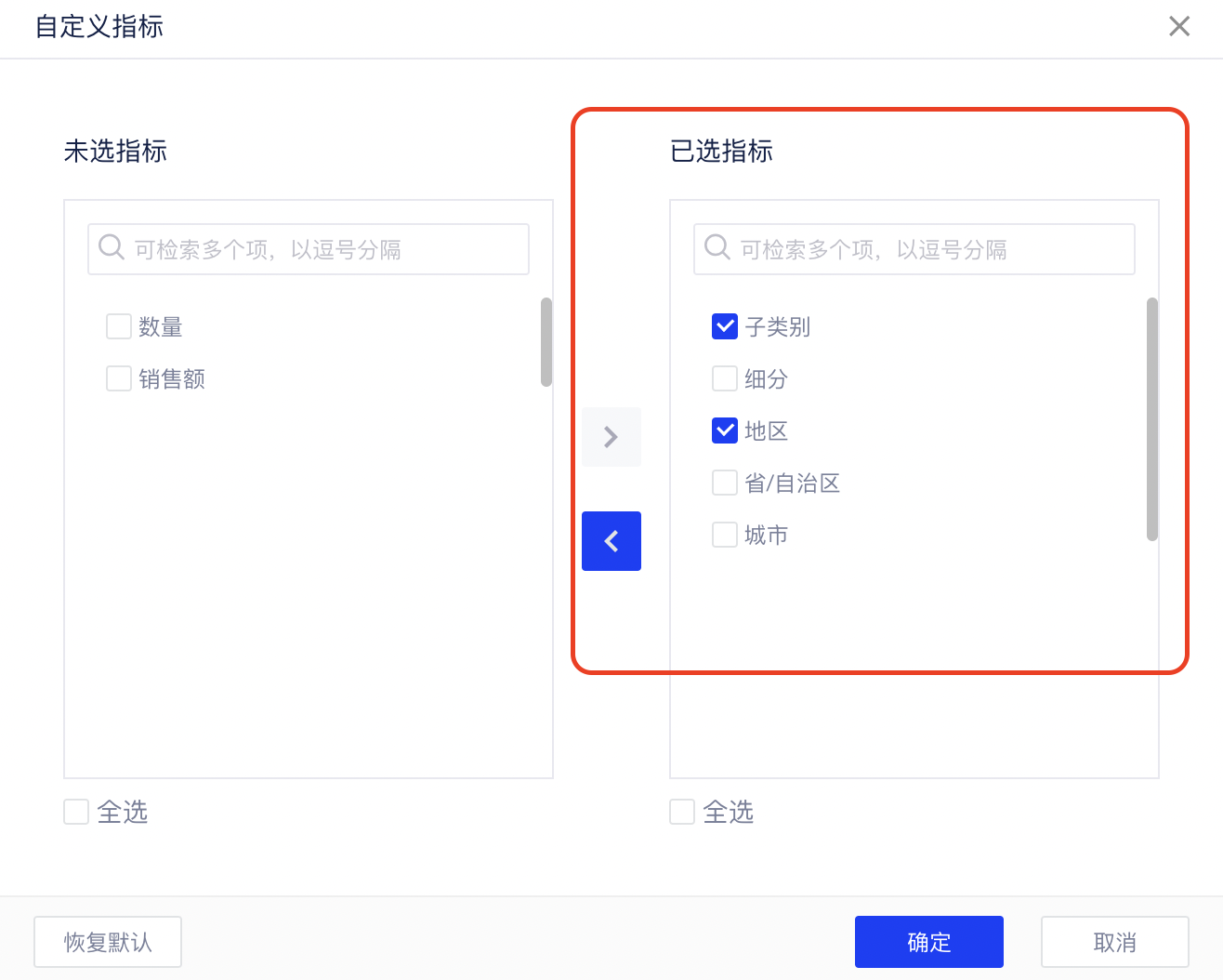 (2)图表优化:自定义指标交互优化。固定指标始终在已选指标列表中(始终在表格上),勾选框置灰,无法打勾将其移动至未选指标。