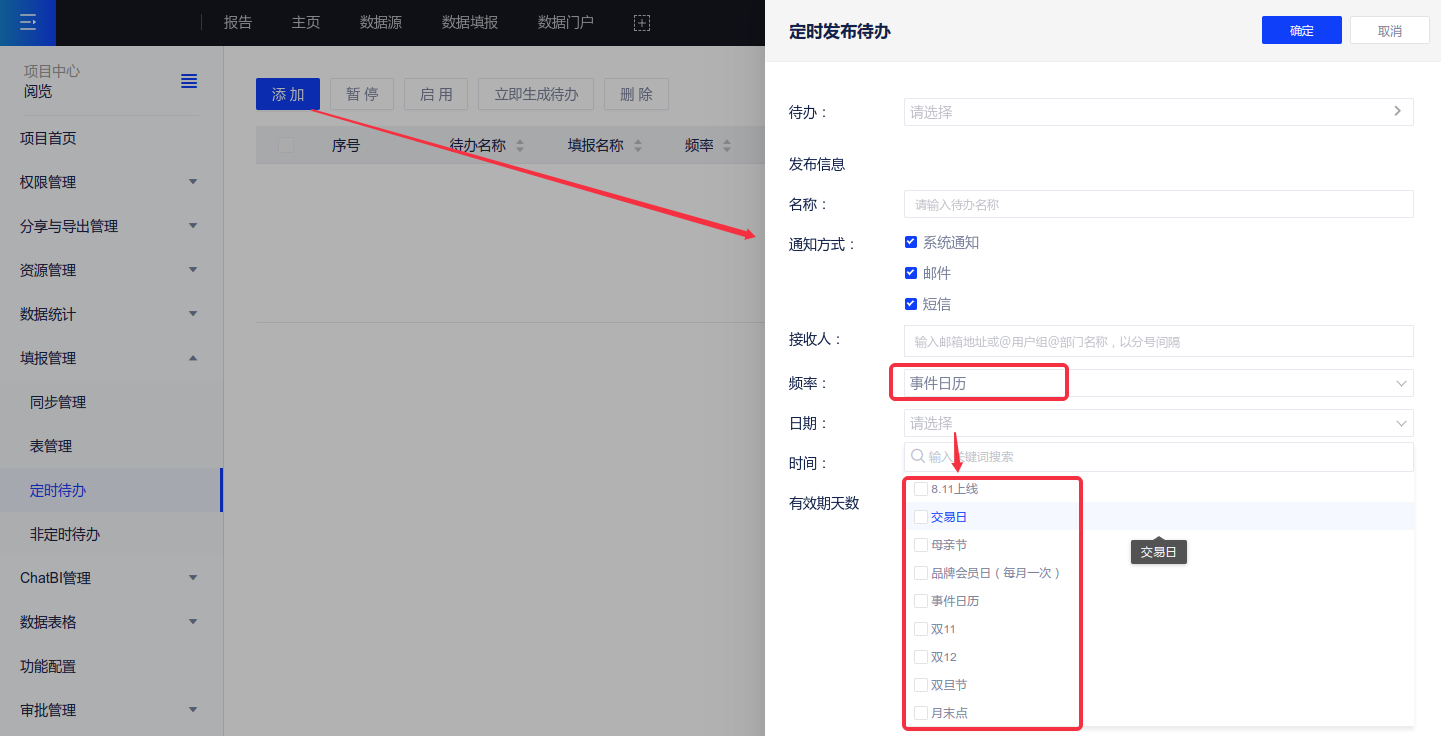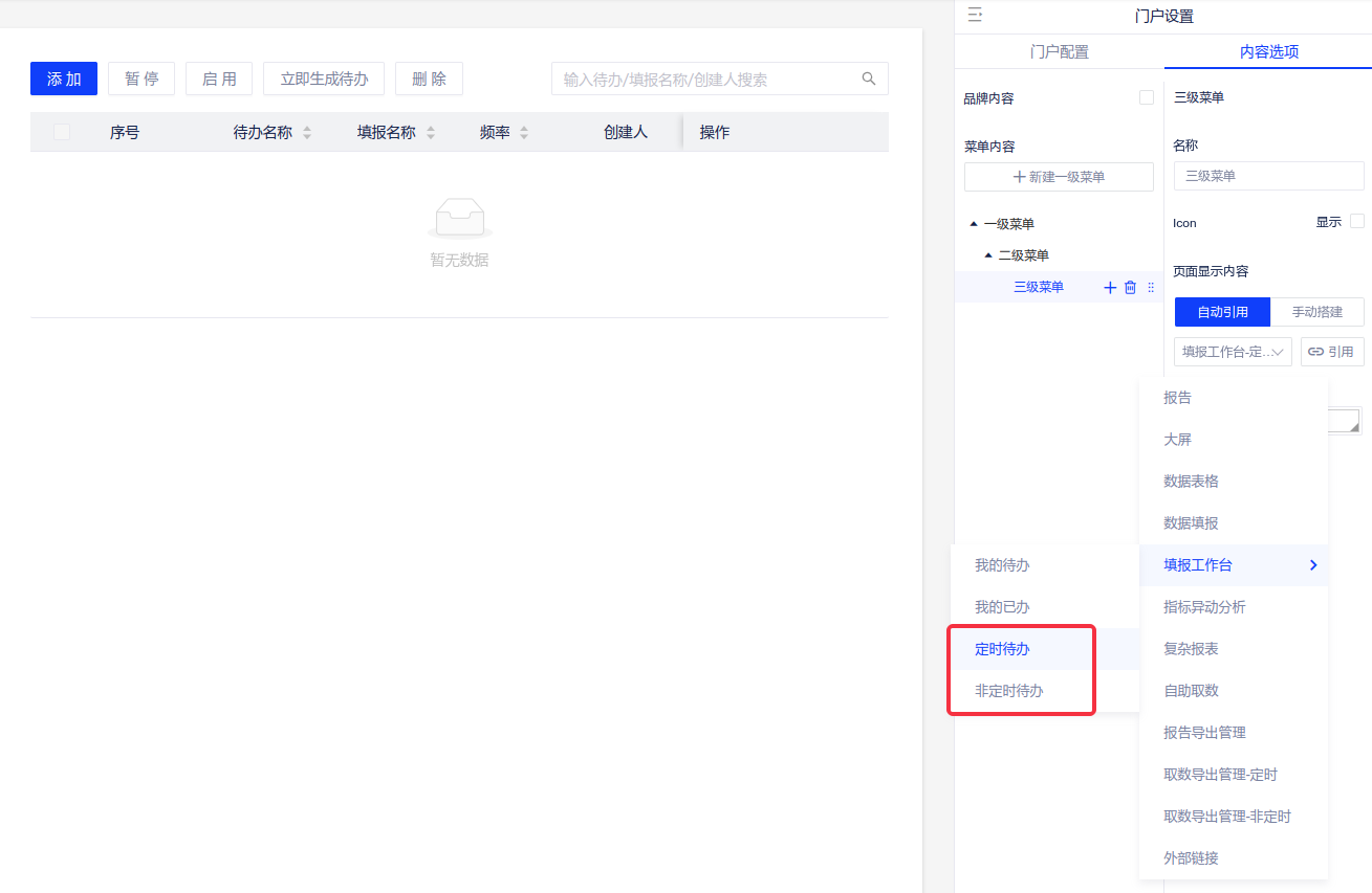 集成内容新增:引入内容新增“填报工作台-定时待办/非定时待办”。引入配置后,用户就可以在门户中发布待办任务,无需再进入项目中心。