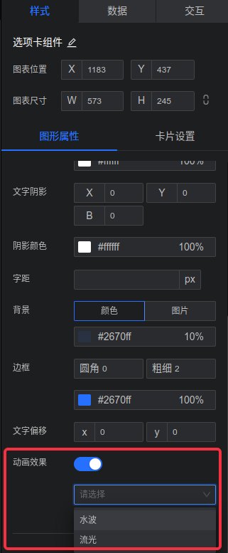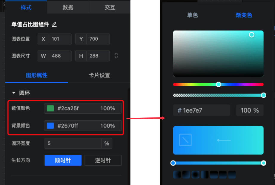 (4)图表增强:单值占比图新增渐变色设置。数值颜色和背景颜色点开后可选择单色or渐变色,默认为单色,切换到渐变色后,可设置渐变类型和颜色。