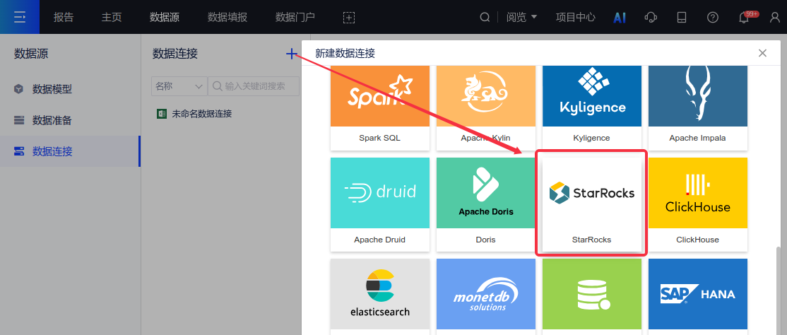 StarRocks 是开源的新一代极速全场景MPP数据库。本版本针对 StarRocks 进行了适配,您可以在[数据源]-[数据连接]-[新建数据连接]中找到它的配置入口。
