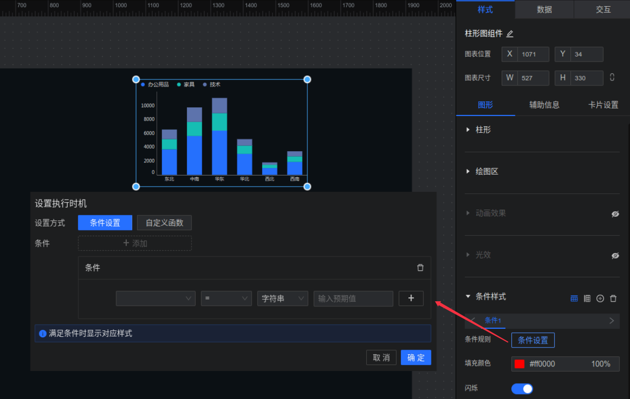 (2)图表增强:柱形图、条形图、折线图、双轴图增加条件格式功能。功能入口在[样式]-[图形]下,新增「条件格式」的设置,可添加多个条件(多个条件之间按顺序依次取满足的第一个条件)、设置条件规则、高亮颜色和高亮闪烁。