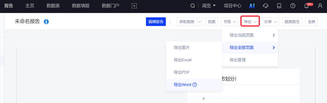 (4)报告支持导出word:当您需要将报告中的文字、表格、图表等导出到Word中,并进行二次处理时,可以使用导出Word功能。支持选择当前或全部页面导出,详情介绍请点击导出word。