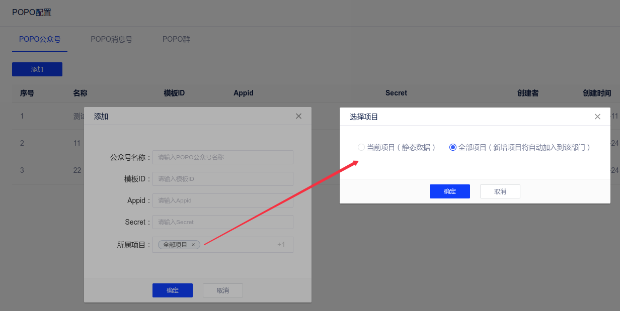 (3)POPO设置优化:新增项目粒度的POPO配置(管理员可以配置当前公众号仅在指定项目生效)。支持POPO公众号、消息号、群分配到项目粒度;推送、预警等只能选到本项目可用的POPO。