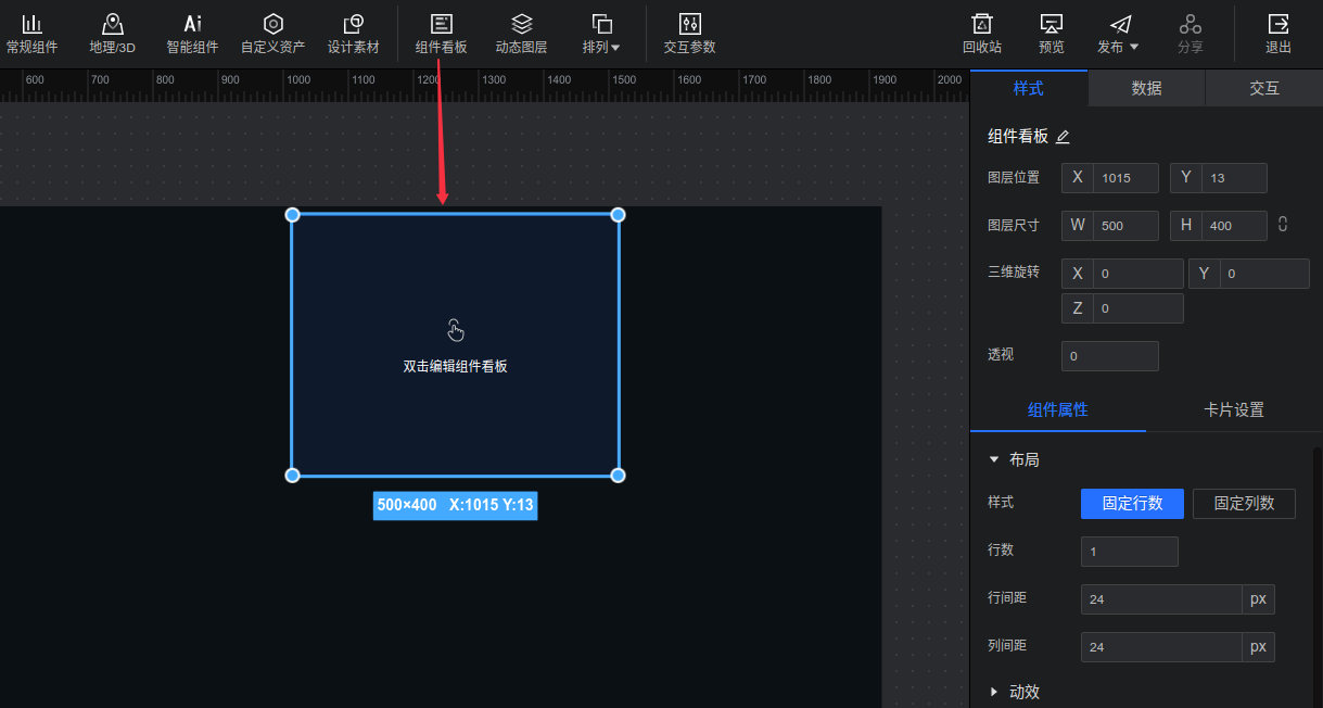 (1)组件新增:新增”组件看板“,将不同控件做组合设计,但对配置组件看板的数据,动效,样式。