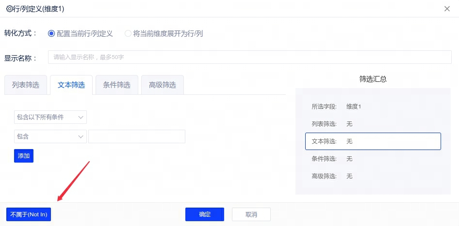 2、特殊筛选条件(not in):行列定义、层级维表筛选新增“不属于(Not In)”筛选功能。