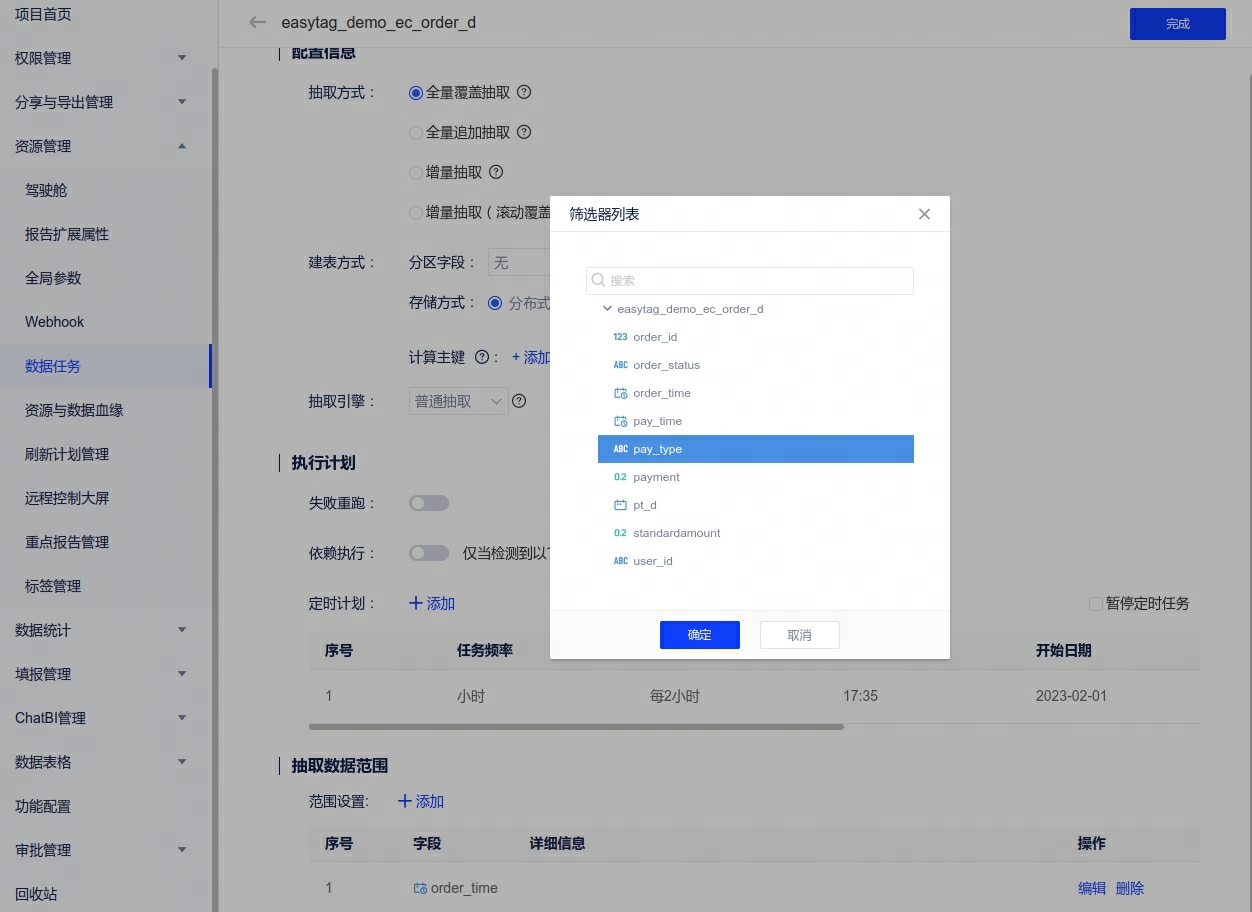 1、数据抽取:抽取设置新增数据抽取范围,过滤掉过时和无效数据,提高抽取效率。在创建或编辑数据任务时,可在底部添加[抽取数据范围],可选择当前表中的字段作为范围依据。
