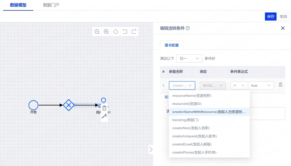 4、审批管理:数据模型在添加网关条件时,可配置发起人是资源创建人分支;
