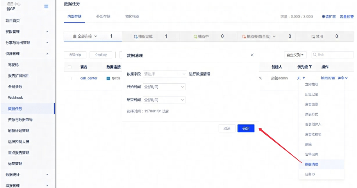 2、数据抽取:数据任务新增数据清理,支持手动清理冗余数据。通过选取表中的日期类型字段作为清理依据,手工单次清理,每次清理仅针对当前数据生效。