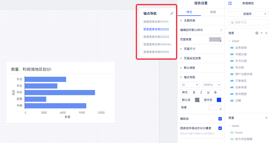 3、报告页支持锚点导航:在报告页存在大量组件,页面较长时,通过锚点导航快速找到想要查阅的内容