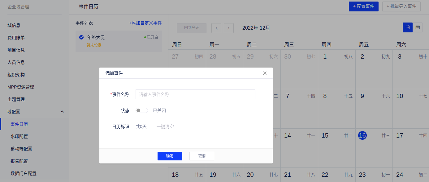 1、新增事件日历:企业域管理中增加自定义事件日历,如定义交易日、大促日等日历;