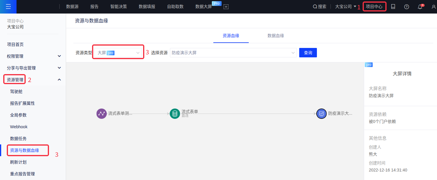 9、支持在项目中心的血缘管理模块查看数据大屏的资源依赖