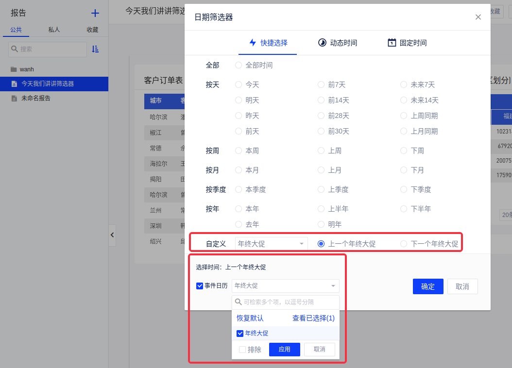 报告的日期筛选中可以使用事件日历,支持前一个事件日等选择,支持包含和排除事件日