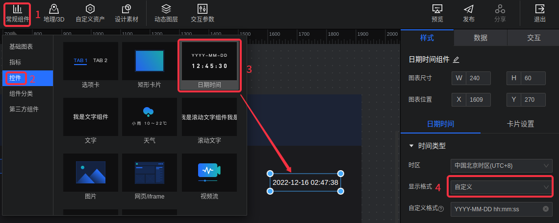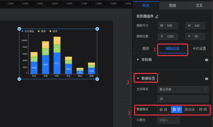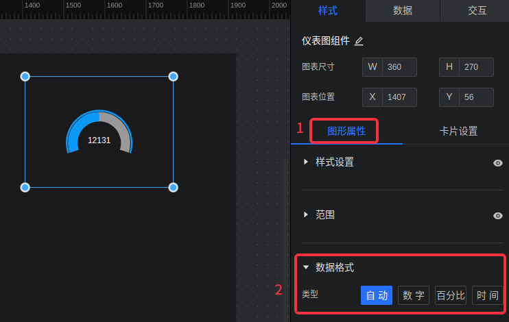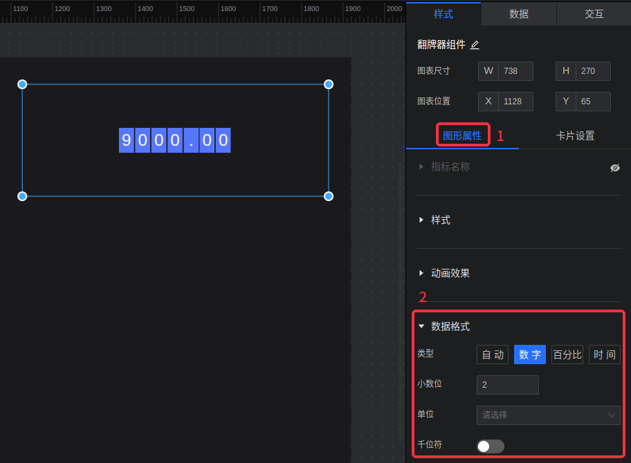 8、支持设置翻牌器、仪表图、柱形图、饼图等各类图表中数据展示的数据格式