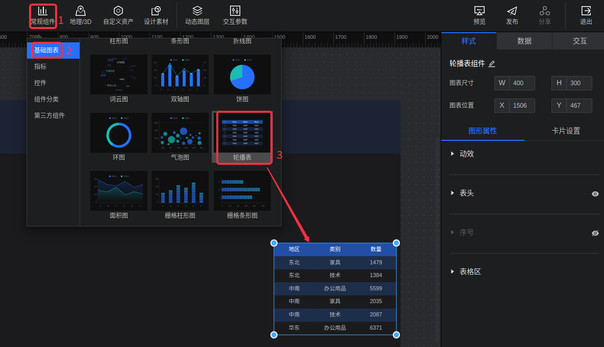 3、新增“轮播表格”组件,自动轮播展示多行数据