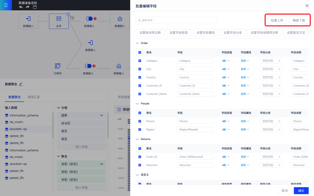1、数据模型:批量字段配置支持通过上传excel进行批量设置