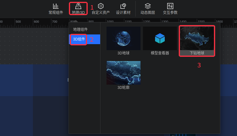 1、新增“地球下钻”组件,呈现地理类数据时,可实现从3D地球下钻至平面地图的动效