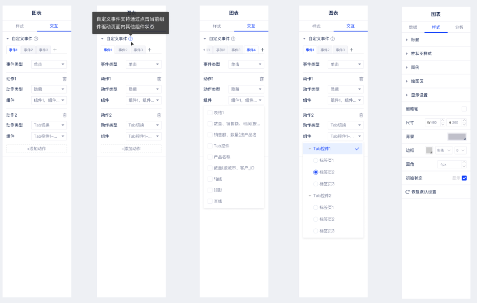 6、报告支持自定义交互事件:部分组件新增交互设置配置面板,支持通过点击的方式,与其他组件之间完成隐藏、显示、Tab切换等联动交互