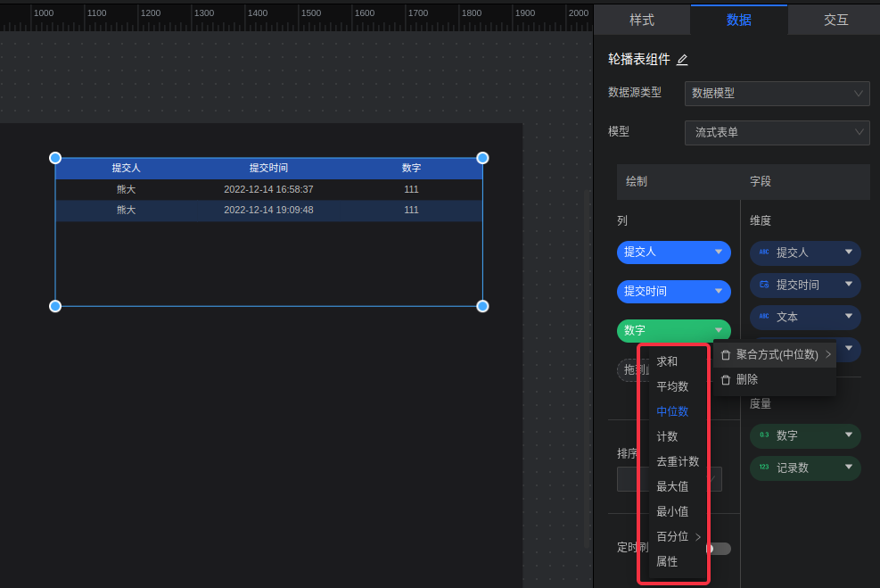 7、“数据模型”数据源,支持修改字段的类型、聚合方式;支持拖拽调整字段为维度、度量