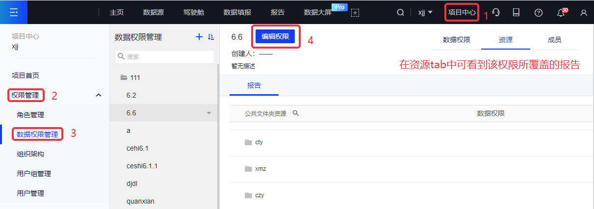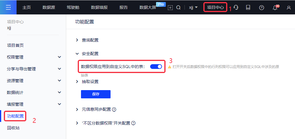 (2)在项目中心支持配置数据权限应用到自定义SQL中的表。