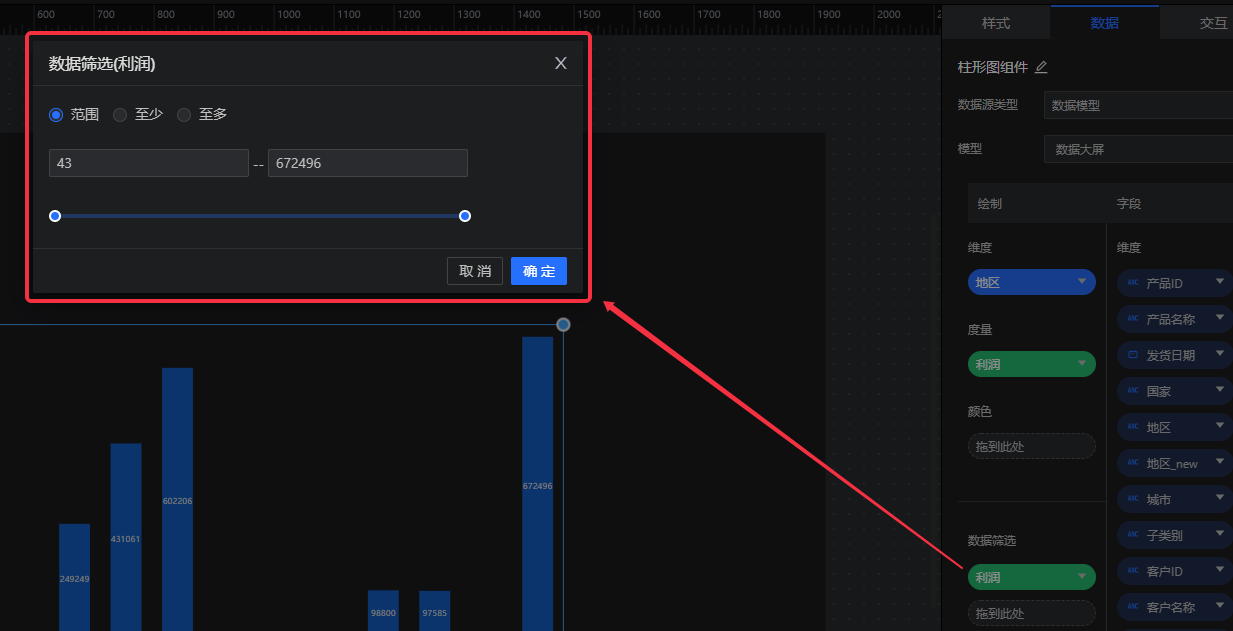 • 度量字段支持范围筛选(有范围、至少、至多3种筛选方式)