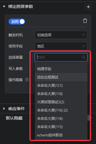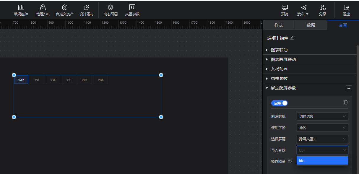 • 如下图所示,组件的“交互”模块里增加了“绑定跨屏参数”设置,可选择将字段值传递至其他大屏的交互参数;