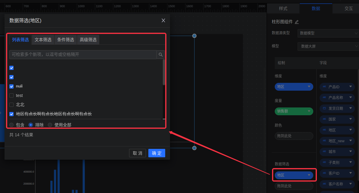 • 维度字段(字符串、整数、小数类型)的支持列表筛选、文本筛选、条件筛选和高级筛选(TopN)