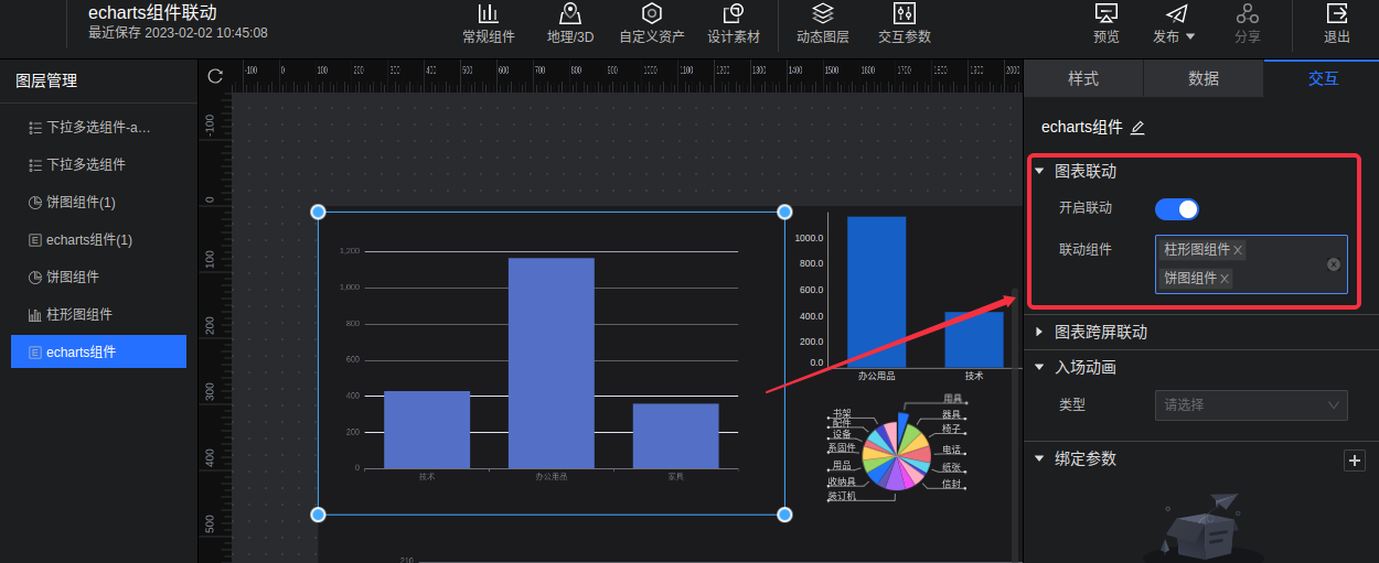 echarts组件配置图表联动时,可以选择其他组件;其他组件配置图表联动时,也可以选择echarts组件。