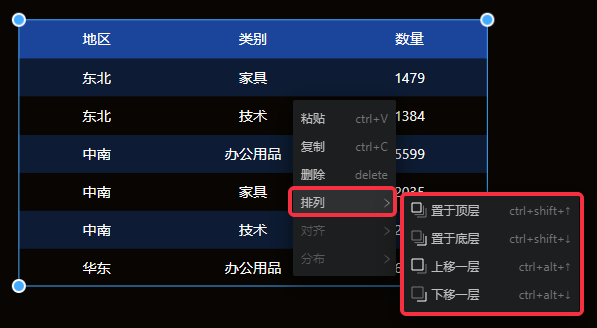 组件排列,对于一个及以上组件,支持置于顶层、置于底层、上移一层、下移一层。