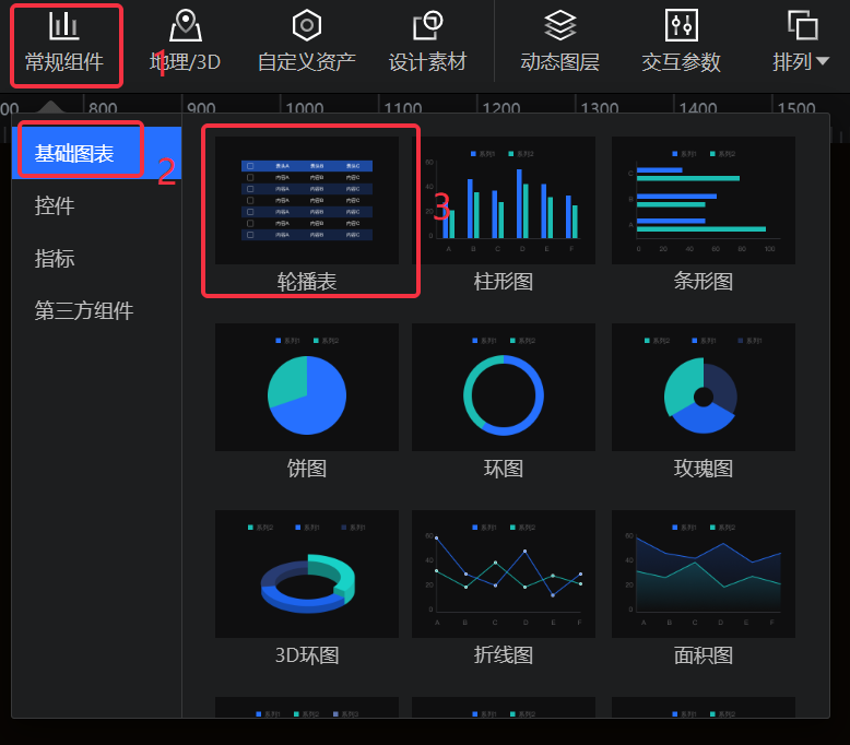 添加3D地图,可以添加标记点、飞线、柱状体子组件