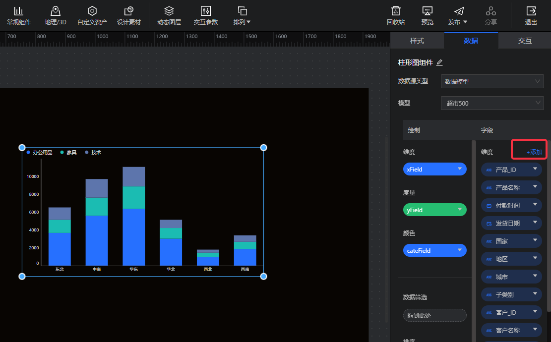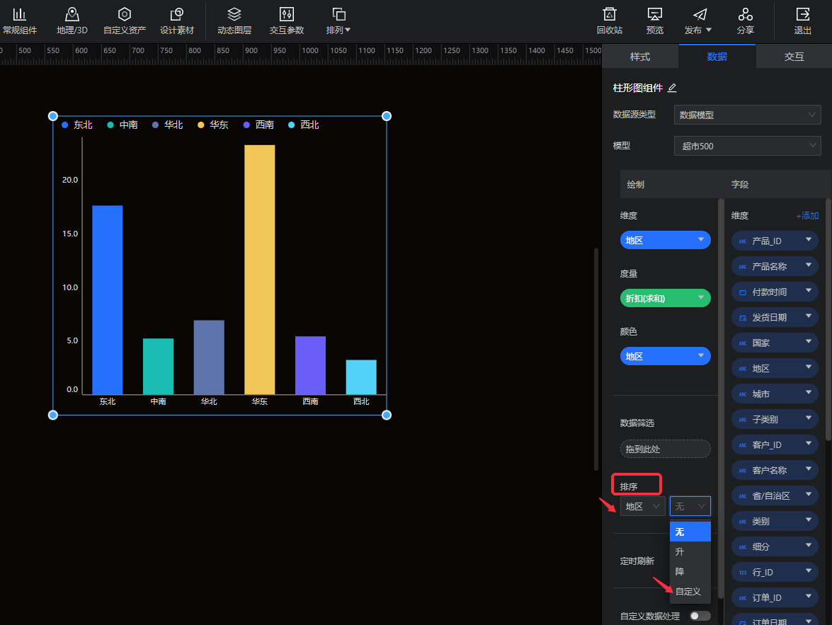 针对维度字段,可以设置自定义排序,灵活置顶置底指定的维度成员
