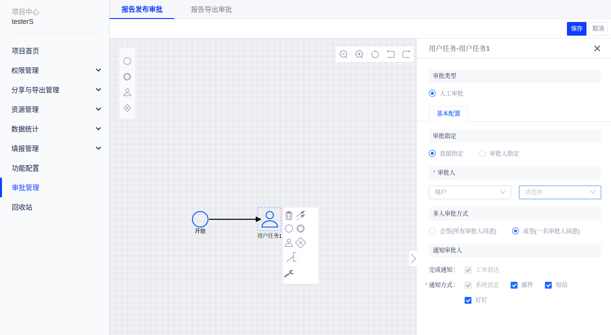 (1)在项目中心-审批管理,管理员先创建报告导出审批流程