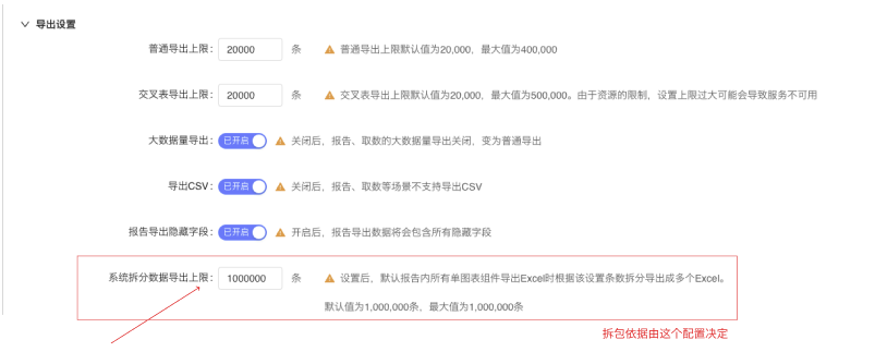 (2)导出数据超过100万条(具体数据可配置)时可分成多个文件打包,之后进入导出管理页面下载。拆包依据在后台管理配置:产品后台-系统拆分数据导出上限(此功能仅私有部署版本客户可用)