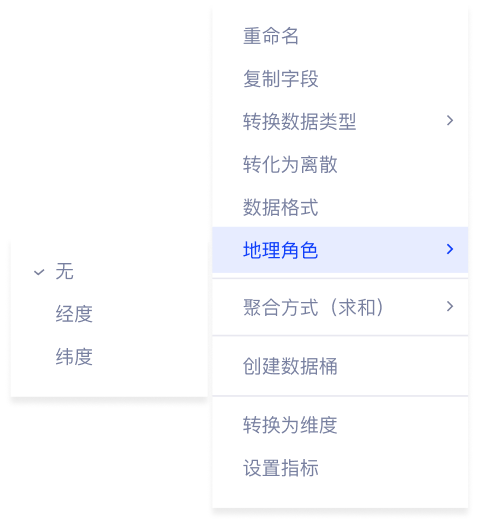 - 整数型、小数型度量字段支持修改为经纬度地理角色,入口在【数据格式】下方新增【地理角色】功能,默认为无