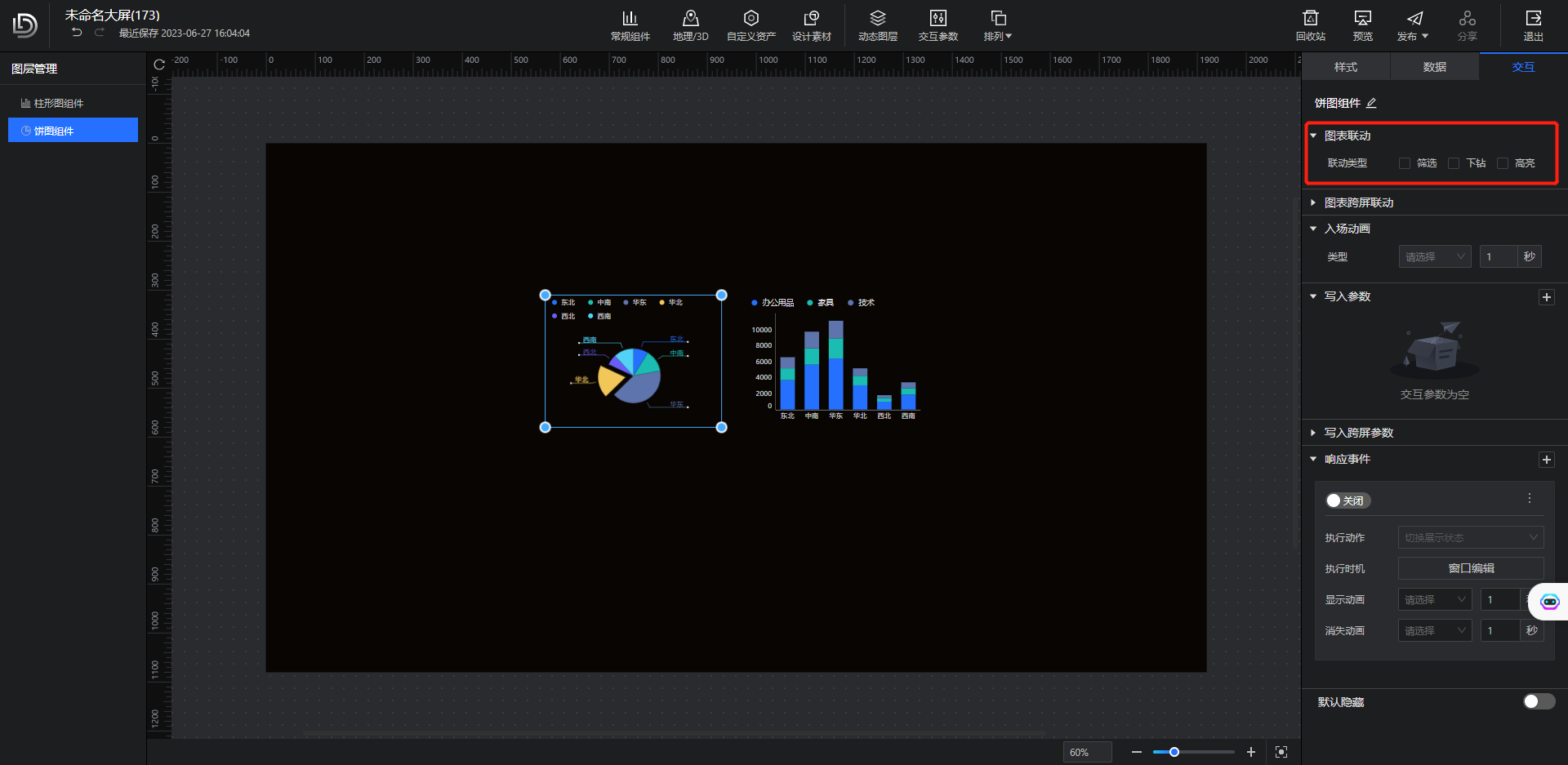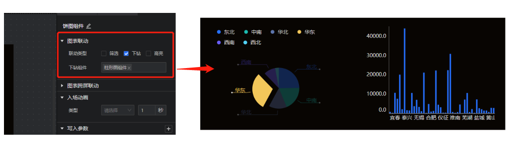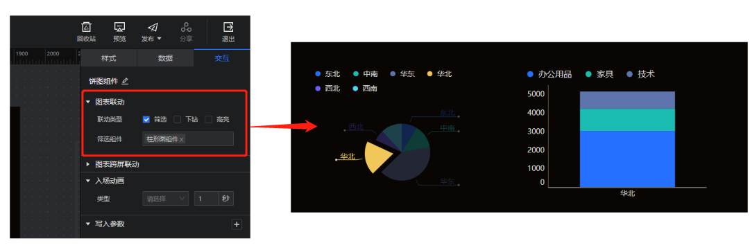 (3)图表间的联动方式增强,支持筛选、下钻、高亮三种联动方式