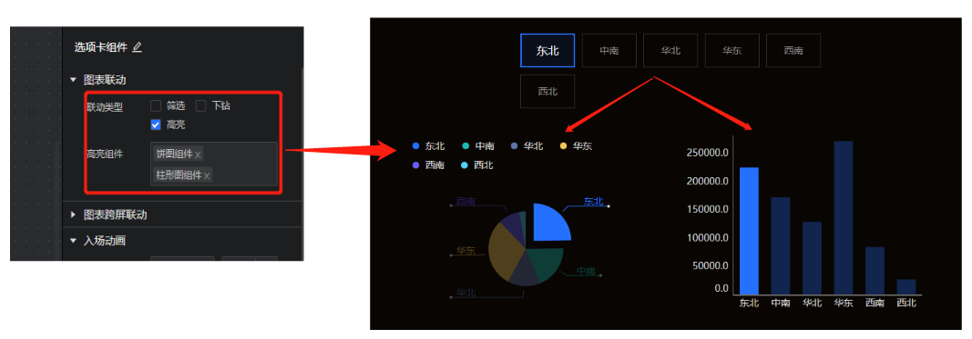高亮联动:当前版本高亮联动功能仅支持Tab组件,点击任一Tab按钮,相应联动图表会高亮展示该组的数据