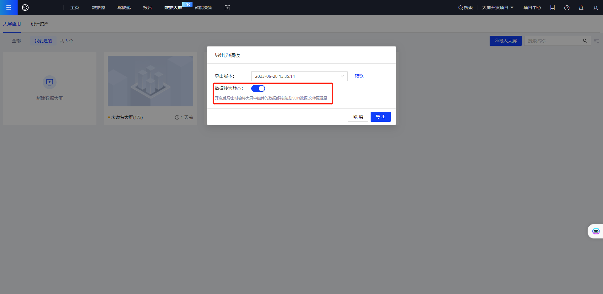 - 关闭按钮:大屏依赖的数据模型被同步导出