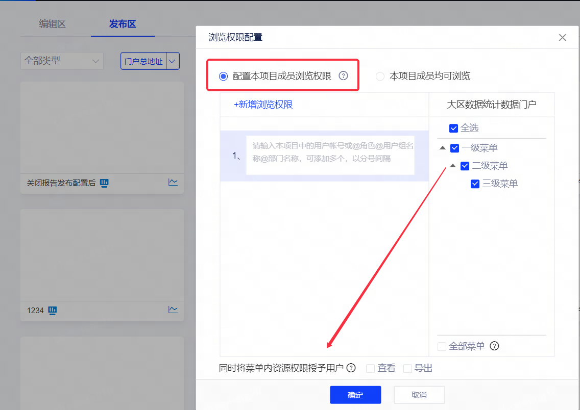 - 项目管理员在数据门户 - 发布/更新发布、发布区 - 浏览权限设置界面,支持设置是否同时授予菜单所引用资源的查看权限和导出权限